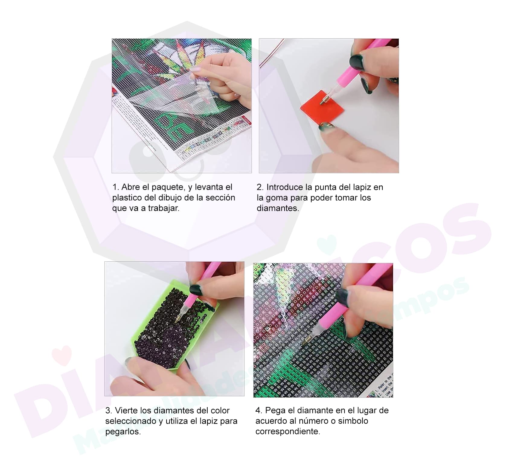 El lienzo incluye todo lo necesario para completarlo (lápiz, bandeja, goma, diamanticos de colores)